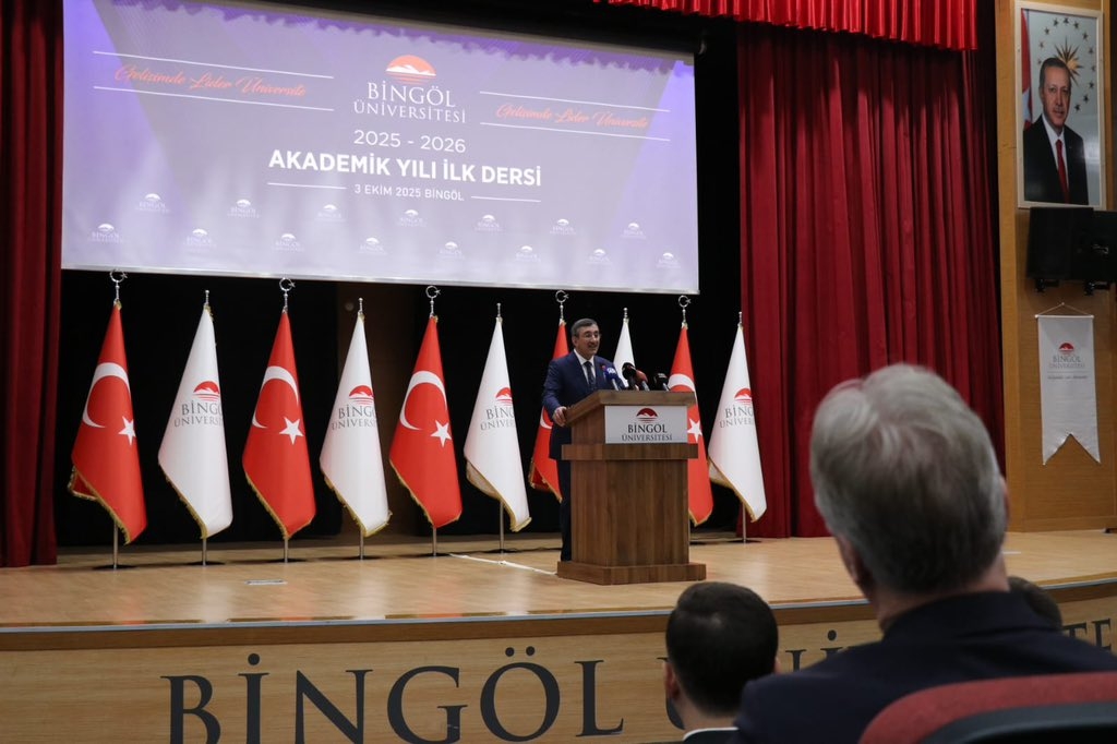 Bingöl Üniversitesi'nde düzenlenen törende, Bingöl Üniversitesi Rektörü Prof. Dr. Erdal Çelik ve Valimiz Sayın Ahmet Hamdi Usta açılış konuşmalarını yaptı. Ardından Cumhurbaşkanı Yardımcımız Sayın Cevdet Yılmaz öğrencilerimize hitap ederek gençlerin bilgi üretiminde aktif rol almasının, eleştirel düşünceye sahip olmasının ve etik değerlere bağlılığının Türkiye'nin güçlü yarınları için taşıdığı önemi vurguladı. Öğrencilerin geleceğe umutla bakmaları gerektiğini belirten Yılmaz, bilgi üretmenin, düşünmenin ve değerlerle hareket etmenin Türkiye'nin kalkınmasında vazgeçilmez olduğunun altını çizdi.