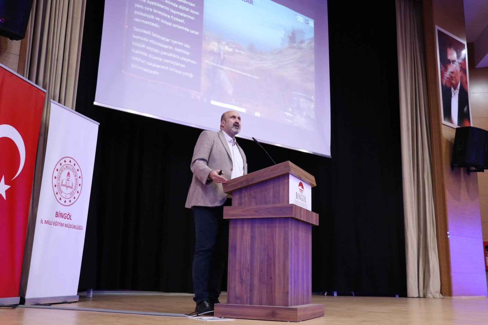 Konuşmaların ardından SODİMER Başkanı Prof. Dr. Levent Eraslan, dijital çağda ailelerin ve eğitimcilerin karşılaştığı yeni riskler üzerine kapsamlı bir sunum yaptı. Eraslan, dijital güvenliğin yalnızca teknik bir konu değil, aynı zamanda sosyal ve psikolojik bir sorumluluk alanı olduğunu belirtti. Dijital ortamlarda çocuk ve gençleri bekleyen tehlikelere dikkat çeken Eraslan, sosyal medya bağımlılığı, dijital oyunlardaki şiddet içerikleri, siber zorbalık, e-dolandırıcılık ve sanal kumar gibi konularda farkındalık oluşturdu. Ailelerin, çocuklarının internet kullanımını yasaklamak yerine anlamaları, birlikte yönetmeleri gerektiğini vurguladı. Prof. Dr. Levent Eraslan, konuşmasını "Çocuklarımızın elinden telefonu almak değil, elinden tutmak zorundayız." sözleriyle tamamladı.
